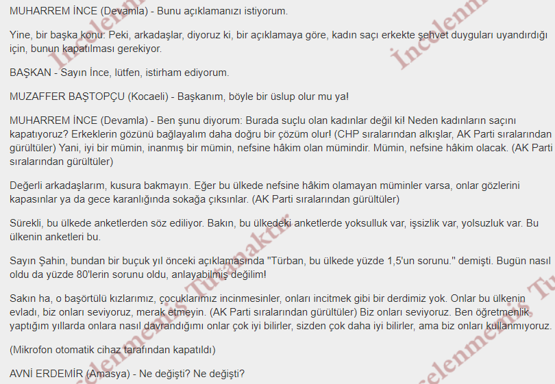 “Ben şunu diyorum: Burada suçlu olan kadınlar değil ki! Neden kadınların saçını kapatıyoruz? Erkeklerin gözünü bağlayalım daha doğru bir çözüm olur!” İnce’nin bu sözleri sırasında CHP sıralarının alkışlaması dikkat çekti.