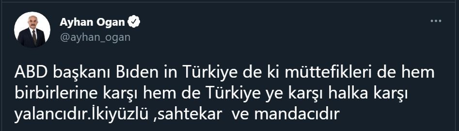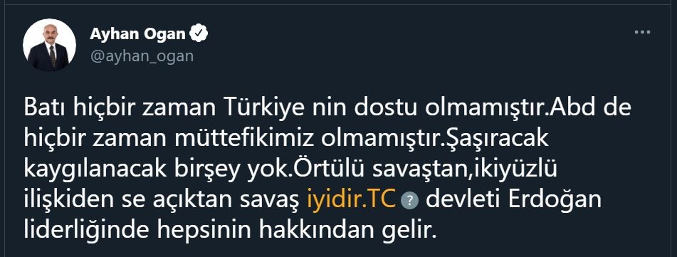 Oğan, Twitter’dan yaptığı açıklamada, “Batı hiçbir zaman Türkiye nin dostu olmamıştır. ABD de hiçbir zaman müttefikimiz olmamıştır. Şaşıracak kaygılanacak bir şey yok. Örtülü savaştan, ikiyüzlü ilişkidense açıktan savaş iyidir. TC Devleti Erdoğan liderliğinde hepsinin hakkından gelir. Bu aziz milletin varlık sebebi emperyalist zalimlere diz çöktürmek, insanlıga huzur ve adaleti tesis etmektir. Bütün dünya mazlumlarına sahip çıkmaktır. Dünyayı kana bulayan katliam ve soykırım yapan zalimlere hesap sormak boynumuzun borcudur. ABD Başkanı Biden'in Türkiye'deki müttefikleri de hem birbirlerine karşı hem de Türkiye'ye karşı halka karşı yalancıdır. İkiyüzlü, sahtekar ve mandacıdır” dedi.