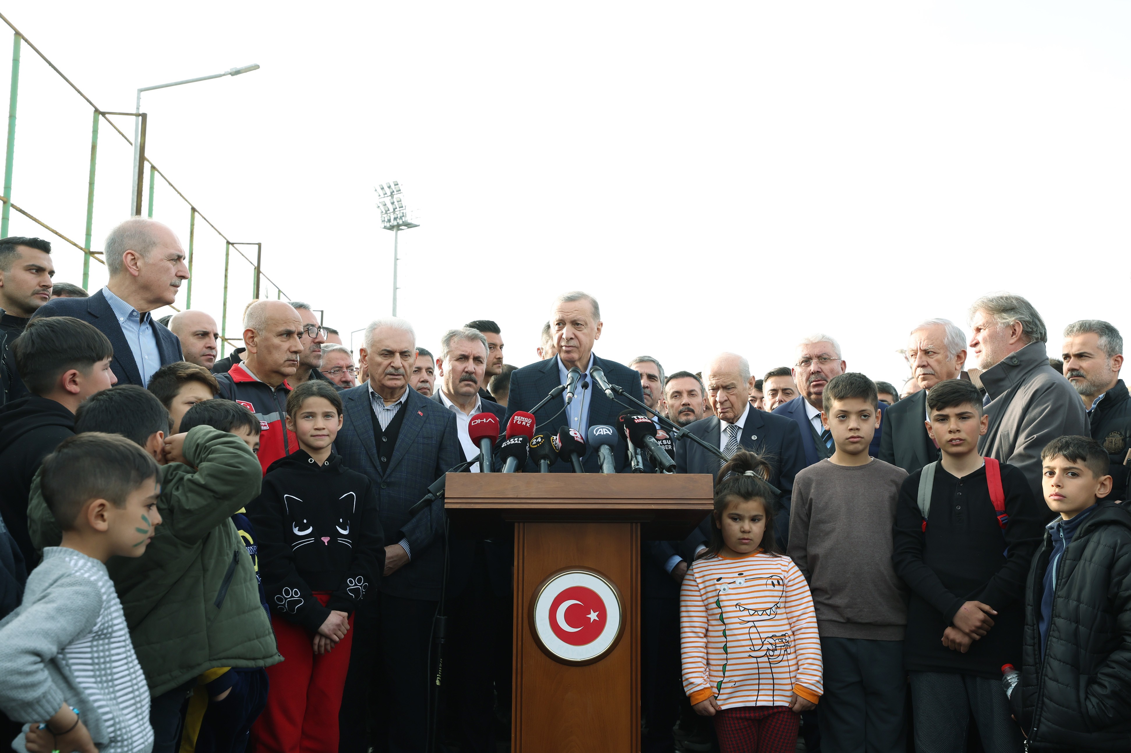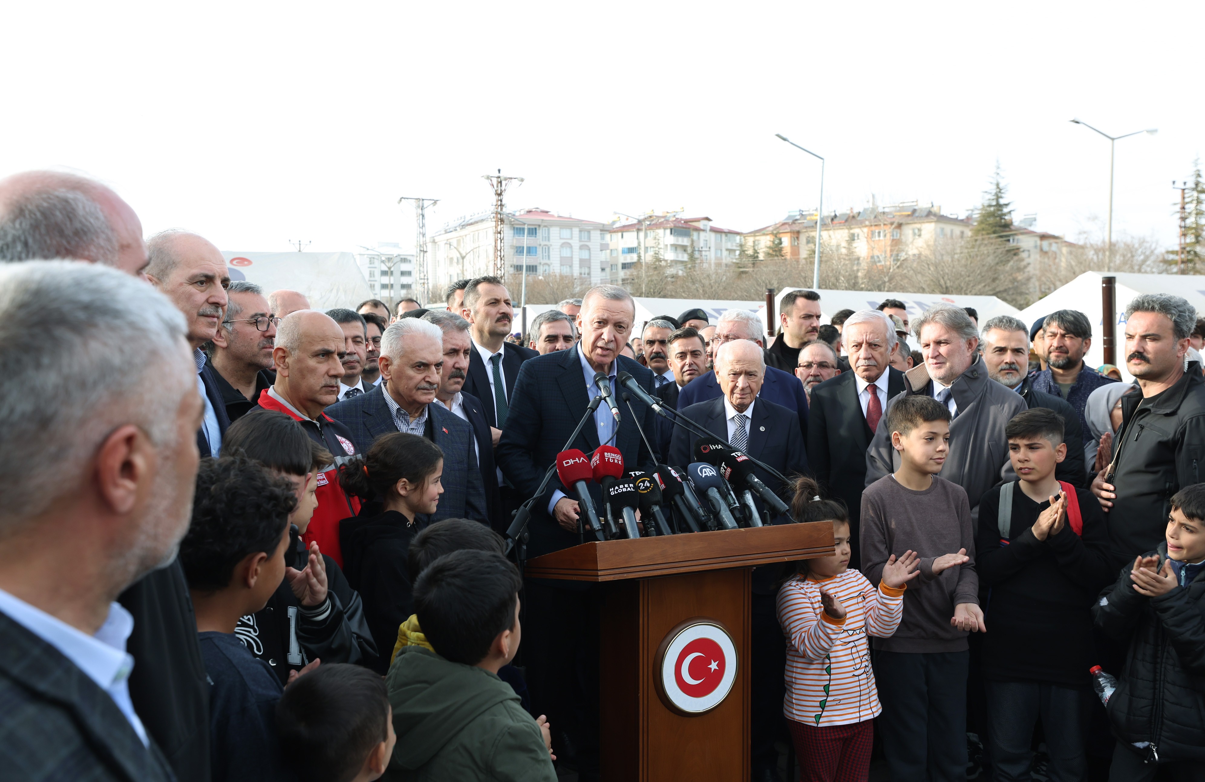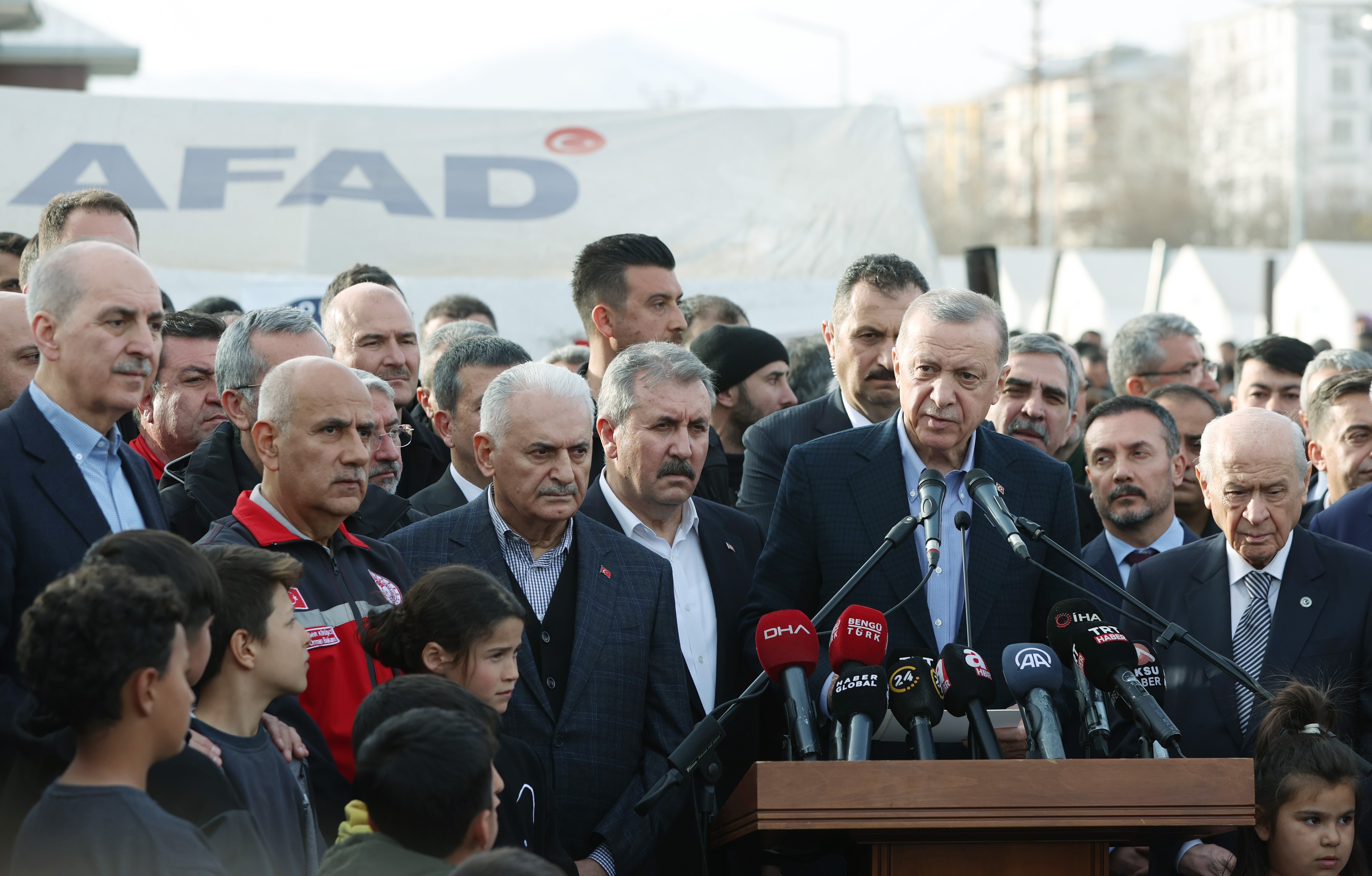 Erdoğan, MHP Genel Başkanı Devlet Bahçeli ve BBP Genel Başkanı Mustafa Destici ile 6 Şubat'ta meydana gelen depremlerden etkilenen Kahramanmaraş'ın Afşin ilçesinde incelemelerde bulundu.