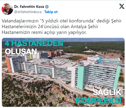 "Vatandaşlarımızın '5 yıldızlı otel konforunda' dediği şehir hastanelerimizin 24'üncüsü olan Antalya Şehir Hastanemizin resmi açılışı yarın yapılıyor"
