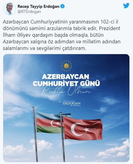 Cumhurbaşkanı Recep Tayyip Erdoğan, Twitter hesabından Azerbaycan Türkçesi ile yaptığı paylaşımda, Azerbaycan Cumhuriyeti Günü'nü tebrik ederek, Cumhurbaşkanı İlham Aliyev'e ve Azerbaycan halkına sevgilerini iletti.