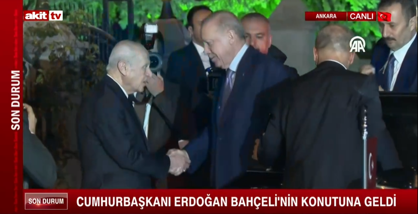Cumhurbaşkanı Recep Tayyip Erdoğan, Milliyetçi Hareket Partisi (MHP) Genel Başkanı Devlet Bahçeli'nin Beytepe’deki evinde bir araya geldi. Bahçeli, Erdoğan’ı karşılamak için evinin önüne çıktı. Basına kapalı gerçekleşen görüşme yaklaşık 40 dakika sürdü.
