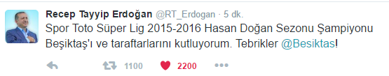 Cumhurbaşkanı Recep Tayyip Erdoğan, Süper Lig'de şampiyonluğa ulaşan Beşiktaş Kulübü'nü kutladı.