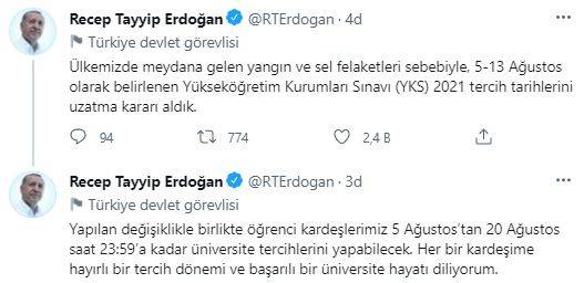 "Ülkemizde meydana gelen yangın ve sel felaketleri sebebiyle, 5-13 Ağustos olarak belirlenen Yükseköğretim Kurumları Sınavı (YKS) 2021 tercih tarihlerini uzatma kararı aldık. Yapılan değişiklikle birlikte öğrenci kardeşlerimiz 5 Ağustos’tan 20 Ağustos saat 23:59’a kadar üniversite tercihlerini yapabilecek. Her bir kardeşime hayırlı bir tercih dönemi ve başarılı bir üniversite hayatı diliyorum."