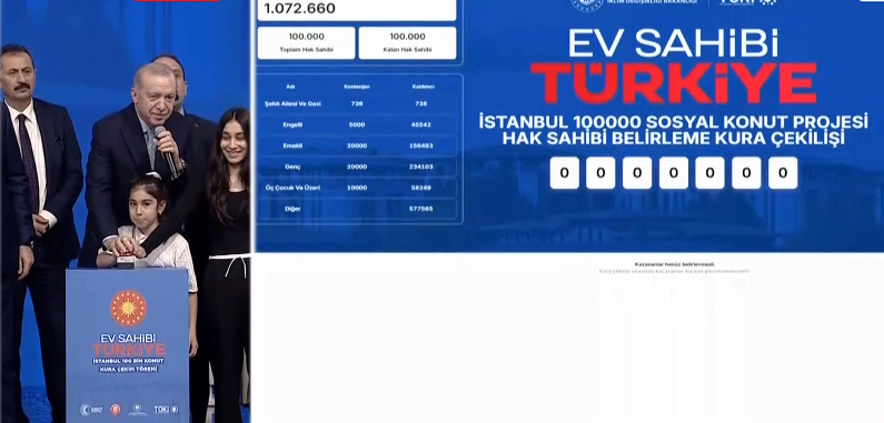 İstanbul “Ev Sahibi Türkiye" Sosyal Konut Kura Çekim Töreni başladı. TOKİ'nin inşa edeceği 500 bin konutun İstanbul'da inşa edilecek bölümü için ev sahipleri bugün belli olacak. Cumhurbaşkanı Recep Tayyip Erdoğan da törende açıklamalarda bulundu.