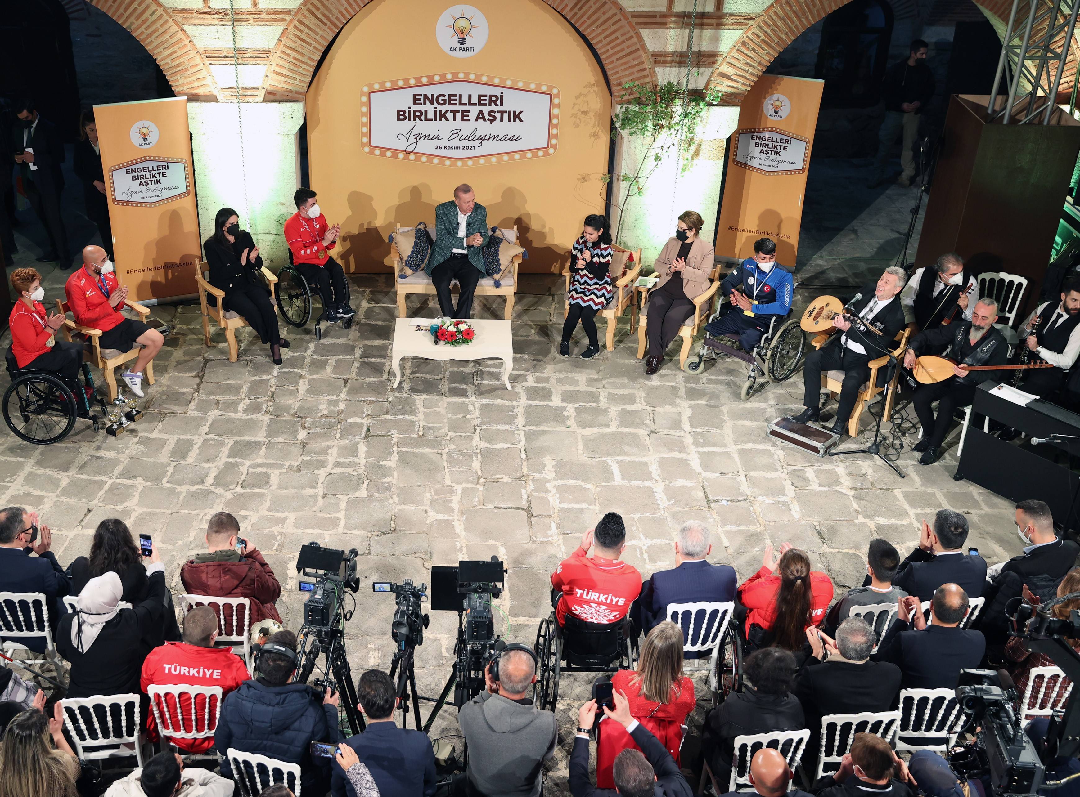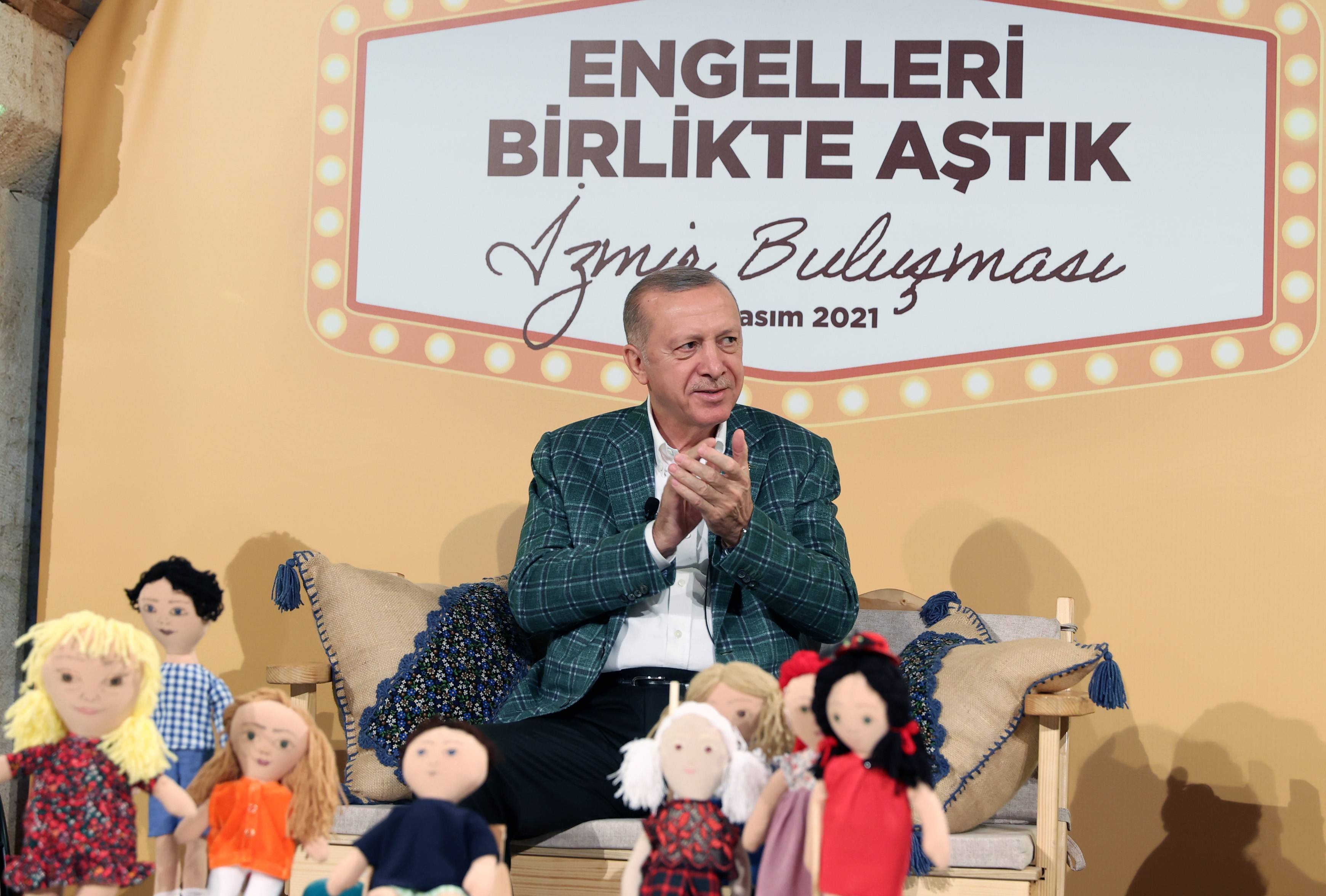 "Engelleri Birlikte Aştık İzmir Buluşması" programında engelli vatandaşlarla bir araya gelen Cumhurbaşkanı Recep Tayyip Erdoğan, engelli vatandaşların sorunlarını dinledi, sorularına cevap verdi ve onlarla birlikte türkü söyledi.