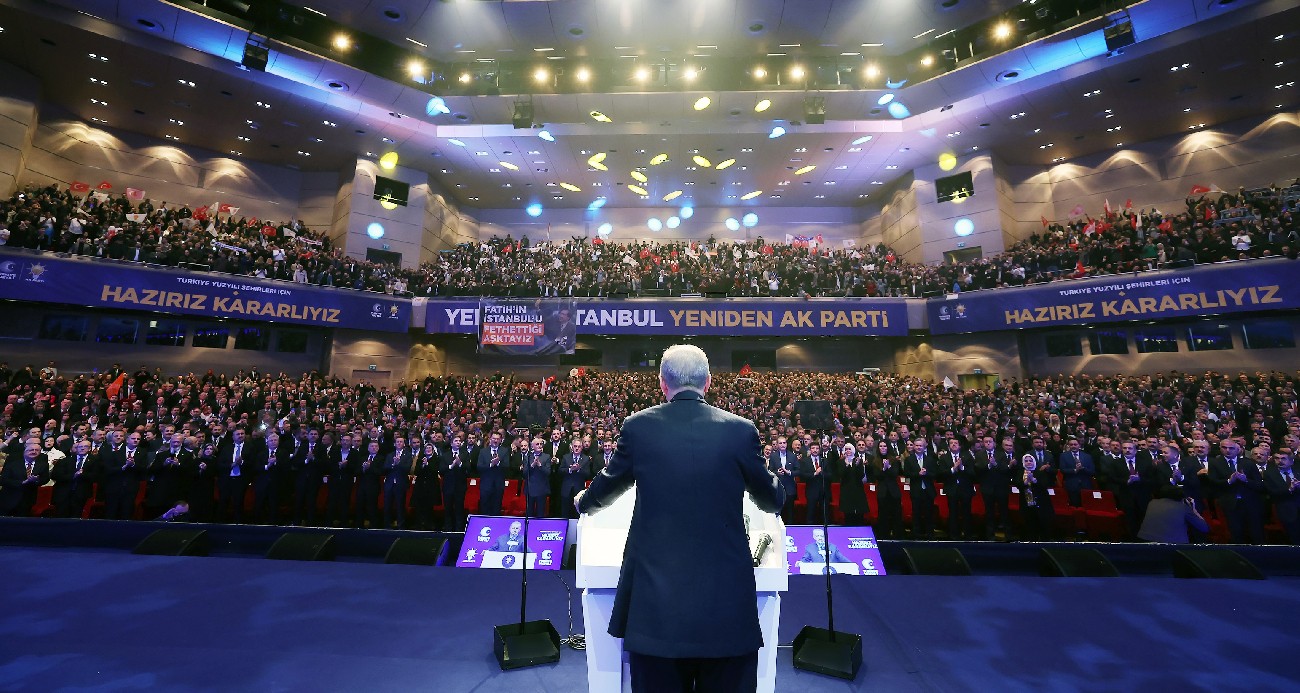 AK Parti’nin Türkiye’de istişare kültürünün uygulandığı tek siyasi parti olduğunu vurgulayan Erdoğan, “Adaylarımızın her birini kapsamlı istişareler, araştırmalar sonunda belirledik. Esasen bizim belediyecilikteki müktesebatımız yeni değildir. Artık 30 yılı bulan şanlı bir geçmişten gelen birikim ve donanıma sahibiz. Gerçekten de 1994 yılından itibaren ülkemizde yeni bir belediyecilik felsefesini hayata geçirmiş bir kadroyuz. Biz milletimize rüştümüzü önce yerel yönetimlerde ispat ettik. Tüm zorluklara, vesayet güçlerinin tüm engellemelerine rağmen hamdolsun belediyecilikte adeta bir destan yazdık. 94 ruhu denilen belediyecilik anlayışıyla Türkiye’de yepyeni bir çığır açtık. Yerel yönetimlerde bir referans haline geldik. Bu başarılarda aldığımız ilhamla ülke yönetimine talip olduk. Çöpten çukurdan çamurdan İstanbul’umuzu nasıl temizlediysek şimdi de tüm Türkiye’de 30 büyükşehir ve onun yanında 51 il belediyeleri ile de bu temizlik için yola çıktık. Partimizin kuruluşundan sadece 15 ay sonra girdiğimiz 2002 seçimlerinde hamdolsun iktidara geldik. Her anı eser ve hizmet siyaseti ile dolu dolu geçen 21 yılı aşkın süredir iktidarımızı kesintisiz sürdürüyoruz. Mayıs ayında yapılan Cumhurbaşkanlığı seçimini kazanarak milletimizden 5 yıl daha yetki aldık” şeklinde konuştu.