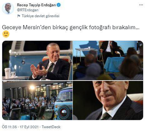 Cumhurbaşkanı Erdoğan, Mersin'de gençlerle bir araya geldiği programa ait görüntüleri sosyal medya hesabından paylaştı. Erdoğan paylaşımında, "Geceye Mersin’den birkaç gençlik fotoğrafı bırakalım…" ifadelerini kullandı.