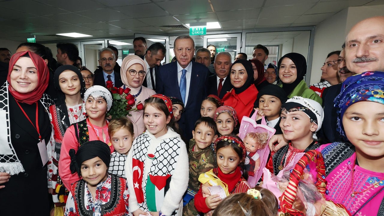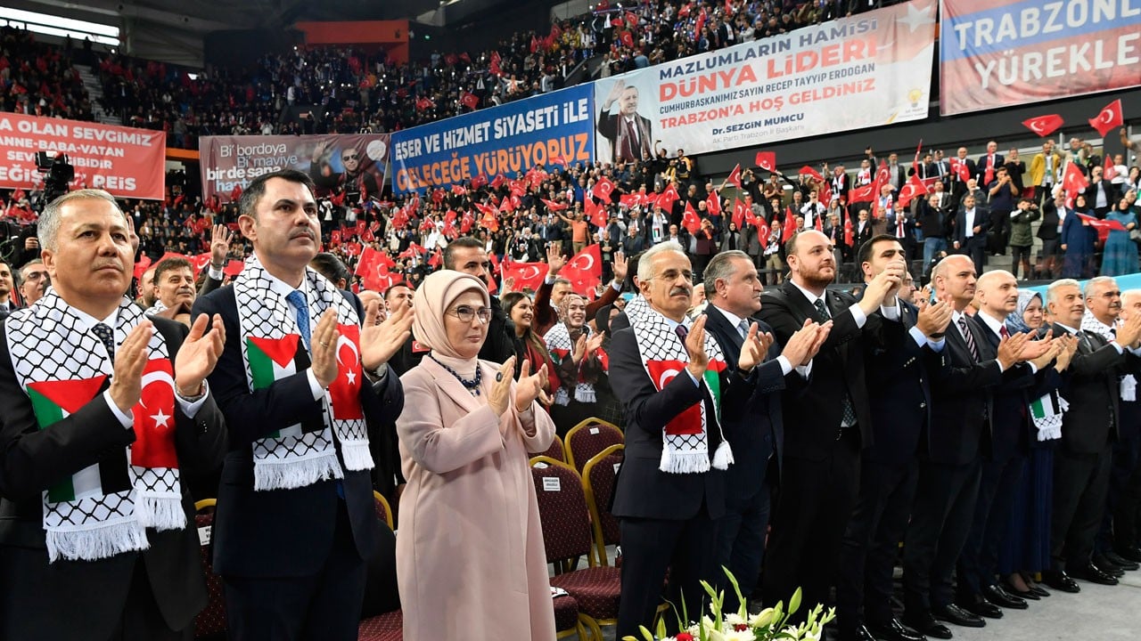 Törene katılanlar, üzerinde Türk bayrağının da yer aldığı Filistin atkılarıyla Cumhurbaşkanı Erdoğan'ı dinledi.