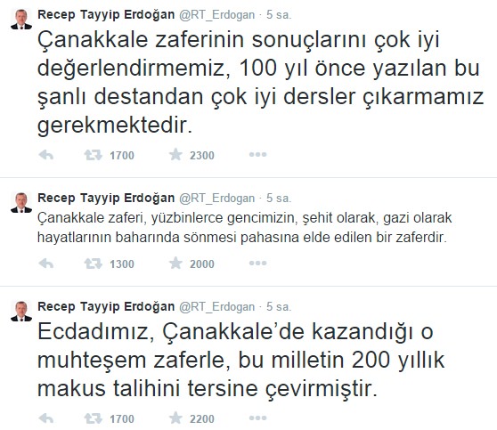 Erdoğan, attığı twitlerde ''Ecdadımız, Çanakkale'de kazandığı o muhteşem zaferle, bu milletin 200 yıllık makus talihini tersine çevirmiştir.