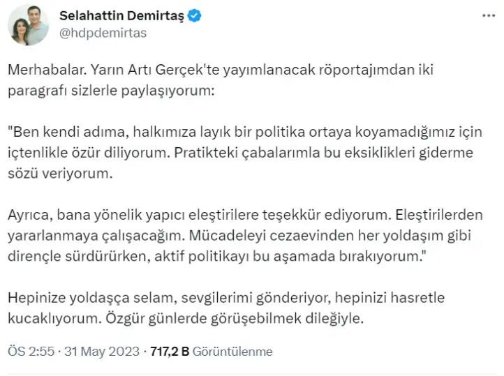 Halkın oylarıyla Recep Tayyip Erdoğan'ın yeniden cumhurbaşkanı seçilmesinin ardından terörden tutuklu bulunan HDP eski Eş Genel Başkanı Selahattin Demirtaş, aktif siyaseti bıraktığını duyurdu.
