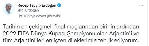 "Tarihin en çekişmeli final maçlarından birinin ardından 2022 FIFA Dünya Kupası Şampiyonu olan Arjantin’i ve tüm Arjantinlileri en içten dileklerimle tebrik ediyorum."