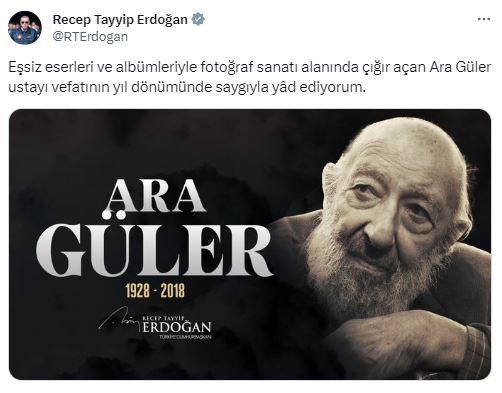 Cumhurbaşkanı Erdoğan, sosyal medya hesabından yaptığı paylaşımda, "Eşsiz eserleri ve albümleriyle fotoğraf sanatı alanında çığır açan Ara Güler ustayı vefatının yıl dönümünde saygıyla yad ediyorum." ifadesini kullandı.