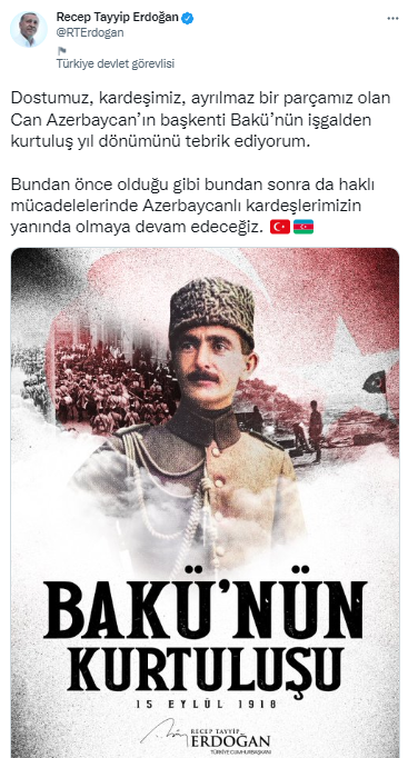 Dün yayımladığı destek mesajını yineleyen Cumhurbaşkanı Erdoğan paylaşımında, "Dostumuz, kardeşimiz, ayrılmaz bir parçamız olan Can Azerbaycan'ın başkenti Bakü'nün işgalden kurtuluş yıl dönümünü tebrik ediyorum. Bundan önce olduğu gibi bundan sonra da haklı mücadelelerinde Azerbaycanlı kardeşlerimizin yanında olmaya devam edeceğiz." ifadelerini kullandı.