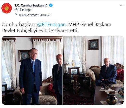 Cumhurbaşkanı Recep Tayyip Erdoğan, MHP Genel Başkanı Devlet Bahçeli'ye evinde ziyaret gerçekleştirdi.