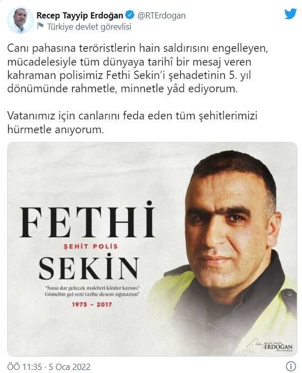 Cumhurbaşkanı Erdoğan, "Canı pahasına teröristlerin hain saldırısını engelleyen, mücadelesiyle tüm dünyaya tarihî bir mesaj veren kahraman polisimiz Fethi Sekin’i şehadetinin 5. yıl dönümünde rahmetle, minnetle yâd ediyorum.