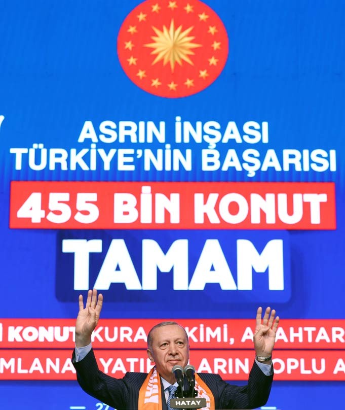Şair ne diyor: “Bir değirmendir cihan, her kimse bekler nevbetin.” Evet. Vaktimizin sınırlı olduğu bu dünyada biz de milletimizin emanetini kutlu bir nöbeti tutar gibi bekleyeceğiz. Siz bize sahip çıktığınız müddetçe, bu milletin başını yere eğdirmeyecek, umutlarını boşa çıkarmayacağız. İşte bugün, dünyada hemen hiçbir ülkenin altından kalkamayacağı büyük bir başarıya Hatay’ımızda bizzat tanıklık ediyoruz. Depremin vurduğu 11 ilimizde yapımı tamamlanan 455 bininci afet konutumuzu hak sahibi kardeşlerimize teslim etmenin gururunu yaşıyoruz.
