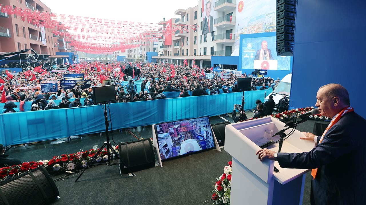 Hükümetimizin enkazın altında kalmasını bekleyen vatan ve millet düşmanlarının sözlerine aldırmadan, sadece işimize odaklandık. Unutmayın, yeis öyle bataktır ki, düşersen boğulursun. Ümide sarıl sımsıkı, seyret ne olursun. Feryadı bırak, kendine gel, çünkü zaman dar. Uğraş ki, telafi edecek bunca zarar var. İstiklal Marşı şairimizin bu mısralarından aldığımız ilhamla yüzyılın en büyük seferberliğini başlatarak şehirlerimizi ihya etmek için kolları sıvadık. 11 ilimizde 174 ayrı alanda 3 bin 481 şantiyede ter döken 200 bin mimar, mühendis ve emekçi kardeşimizle bugünlere ulaştık. Ben şimdi şu binaları görüyorum, Rabbime hamdediyorum. "Ya Rabb, sana hamdolsun, bu kadar kısa zamanda bu binaları bitirmeyi bizlere nasip ettin." Şimdi de kardeşlerimiz burada hayırlısıyla inşallah otursunlar.
