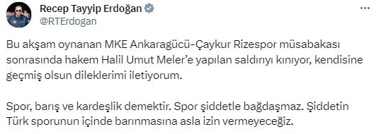 Bu akşam oynanan MKE Ankaragücü-Çaykur Rizespor müsabakası sonrasında hakem Halil Umut Meler’e yapılan saldırıyı kınıyor, kendisine geçmiş olsun dileklerimi iletiyorum.