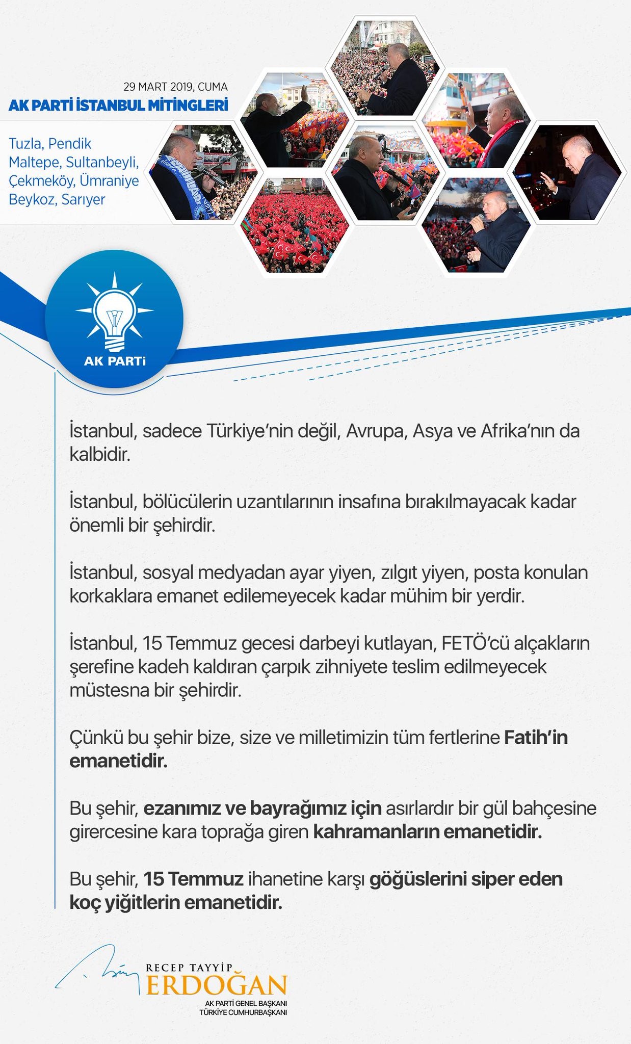 31 Mart seçim kampanyası kapsamında, İstanbul'da Tuzla, Pendik, Maltepe, Sultanbeyli, Çekmeköy, Ümraniye, Beykoz ve Sarıyer'de mitinglerini gerçekleştiren Cumhurbaşkanı Recep Tayyip Erdoğan, resmi Twitter hesabından 'İstanbul' notuyla bir paylaşım yaptı.