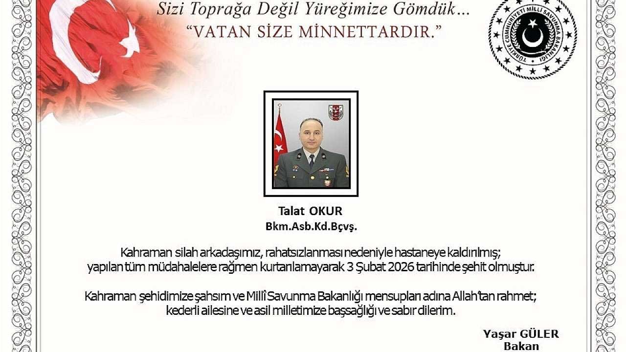 "Kahraman silah arkadaşımız, rahatsızlanması nedeniyle hastaneye kaldınımış; yapılan tüm müdahalelere rağmen kurtanlamayarak 3 Şubat 2026 tarihinde şehit olmuştur.