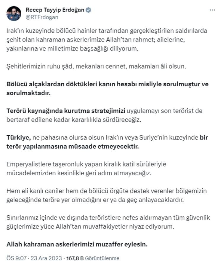 Cumhurbaşkanı Erdoğan, açıklamalarında şunları söyledi: "Irak'ın kuzeyinde bölücü hainler tarafından gerçekleştirilen saldırılarda şehit olan kahraman askerlerimize Allah'tan rahmet; ailelerine, yakınlarına ve milletimize başsağlığı diliyorum.