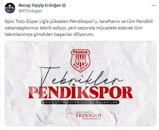 Cumhurbaşkanı Erdoğan, "Spor Toto Süper Lig’e yükselen Pendikspor’u, taraftarını ve tüm Pendikli vatandaşlarımızı tebrik ediyor, yeni sezonda mücadele edecek tüm takımlarımıza şimdiden başarılar diliyorum." ifadelerine yer verdi.