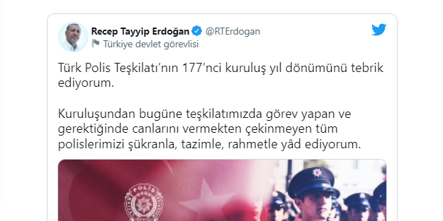 "Türk Polis Teşkilatı’nın 177’nci kuruluş yıl dönümünü tebrik ediyorum. Kuruluşundan bugüne teşkilatımızda görev yapan ve gerektiğinde canlarını vermekten çekinmeyen tüm polislerimizi şükranla, tazimle, rahmetle yâd ediyorum."