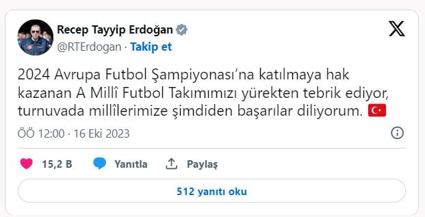 Cumhurbaşkanı Recep Tayyip Erdoğan, sosyal medya hesabından yaptığı paylaşımda, "2024 Avrupa Futbol Şampiyonası’na katılmaya hak kazanan A Milli Futbol Takımımızı yürekten tebrik ediyor, turnuvada millîlerimize şimdiden başarılar diliyorum" dedi.