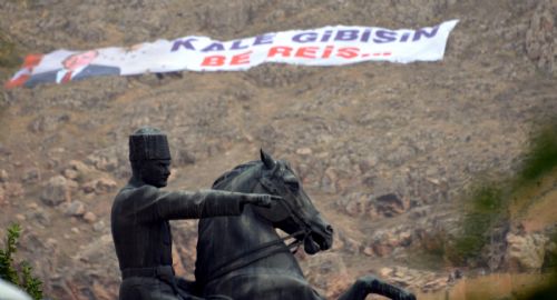 Formayı kabul eden Cumhurbaşkanı Erdoğan bu sırada tarihi Bayburt kalesine asılan kendi resminin de yer aldığı “Kale gibisin be reis” afişini fark eti.