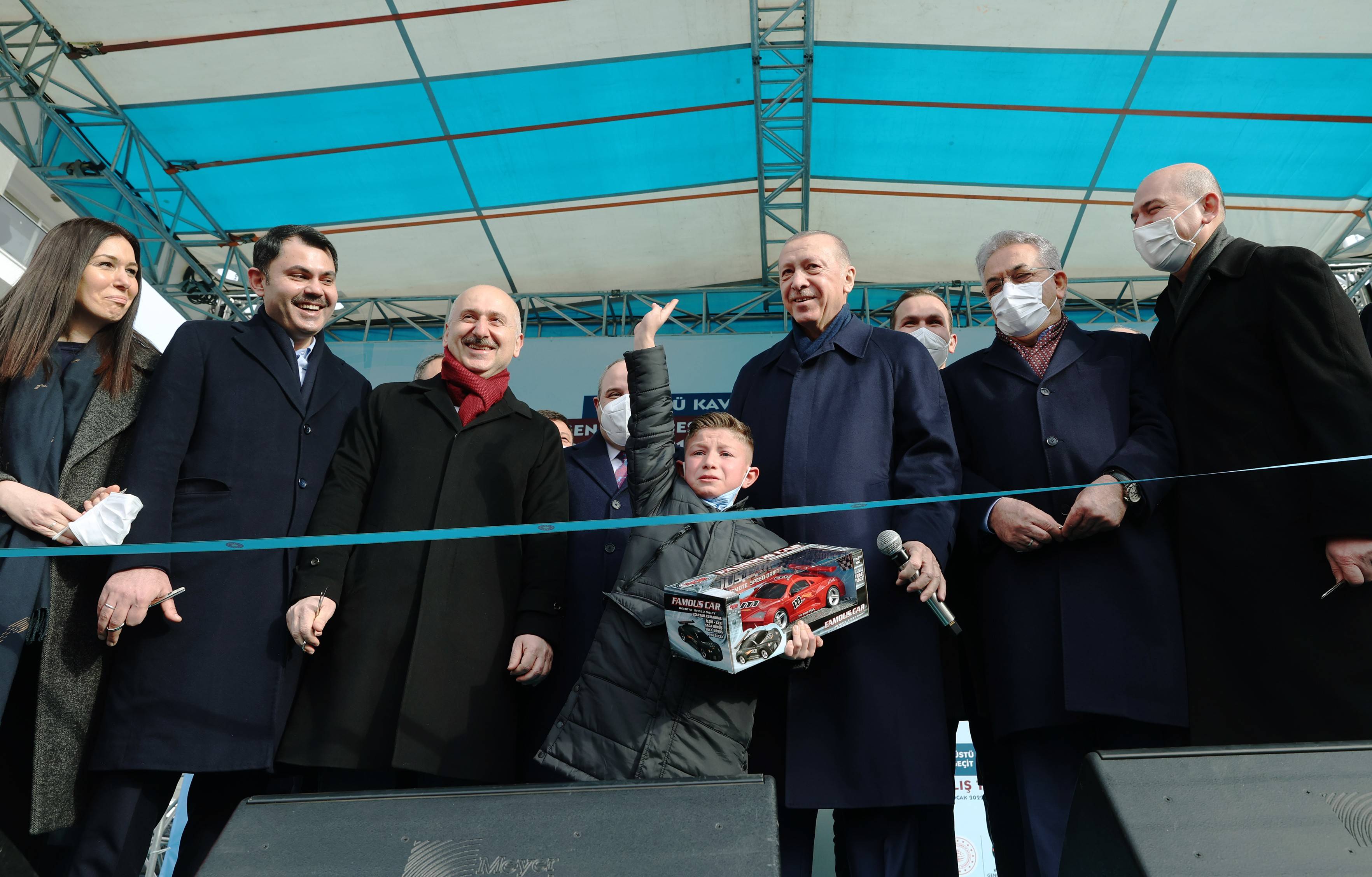 Trabzon’da yapımı tamamlanan projelerin toplu açılış törenine katılan Cumhurbaşkanı Recep Tayyip Erdoğan, kurdele kesiminden önce sahneye çıkmak isteyen küçük çocuğu kırmadı.