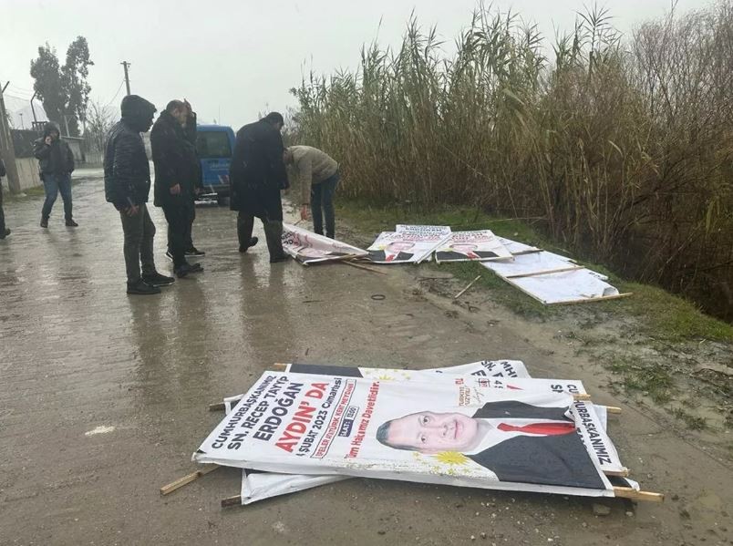 Aydın'da, Cumhurbaşkanı Recep Tayyip Erdoğan'ın pazar günü yapacağı miting öncesinde, kimliği belirsiz kişiler tarafından yol kenarına asılan afişler sökülerek dereye atıldı. Olayla ilgili soruşturma başlatıldı.