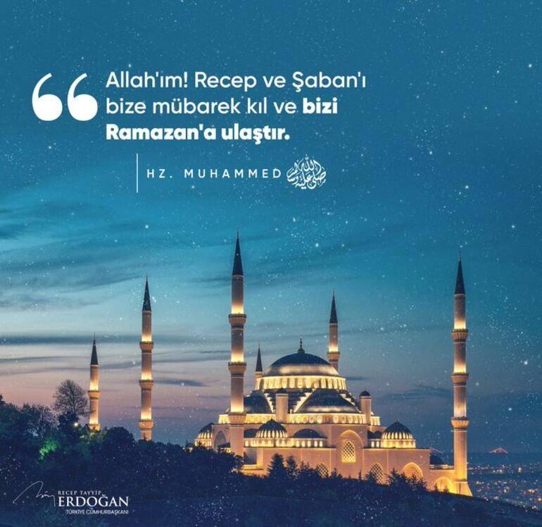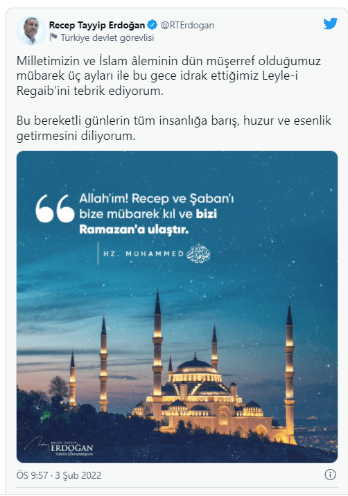 Cumhurbaşkanı Erdoğan'ın paylaşımı şöyle, "Milletimizin ve İslam âleminin dün müşerref olduğumuz mübarek üç ayları ile bu gece idrak ettiğimiz Leyle-i Regaib’ini tebrik ediyorum. Bu bereketli günlerin tüm insanlığa barış, huzur ve esenlik getirmesini diliyorum." dedi.