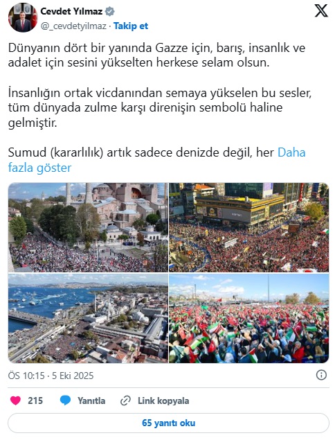 Cumhurbaşkanı Yardımcısı Cevdet Yılmaz, Türkiye genelinde düzenlenen "Gazze Kararlılık Yürüyüşü"ne ilişkin bir paylaşım yaptı. Yılmaz, "Sumud (kararlılık) artık sadece denizde değil, her yerdedir. 86 milyon olarak dualarımız da çabamız da Gazze için, mazlum Filistin halkı içindir" ifadelerini kullandı.