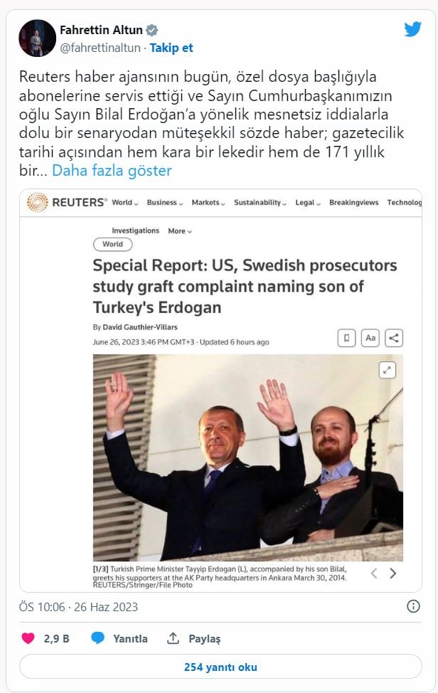 Cumhurbaşkanlığı İletişim Başkanı Fahrettin Altun, İngiltere merkezli Reuters haber ajansının Cumhurbaşkanı Recep Tayyip Erdoğan'ın oğlu Bilal Erdoğan hakkındaki haberi hakkında sosyal medya hesabından paylaşımda bulundu.