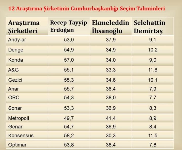 Türkiye genelinde şu ana kadar sandıkların yüzde 93,8'i açıklandı. Recep Tayyip Erdoğan oyların yüzde 53'ünü aldı. Ekmeleddin İhsanoğlu yüzde 37,8 oy alırken, Selahattin Demirtaş ise yüzde 9,1'nin aldı. Bu sonuçlara göre 12 anket şirketinden en iyi tahmini Andy-Ar şirketi yaptı.