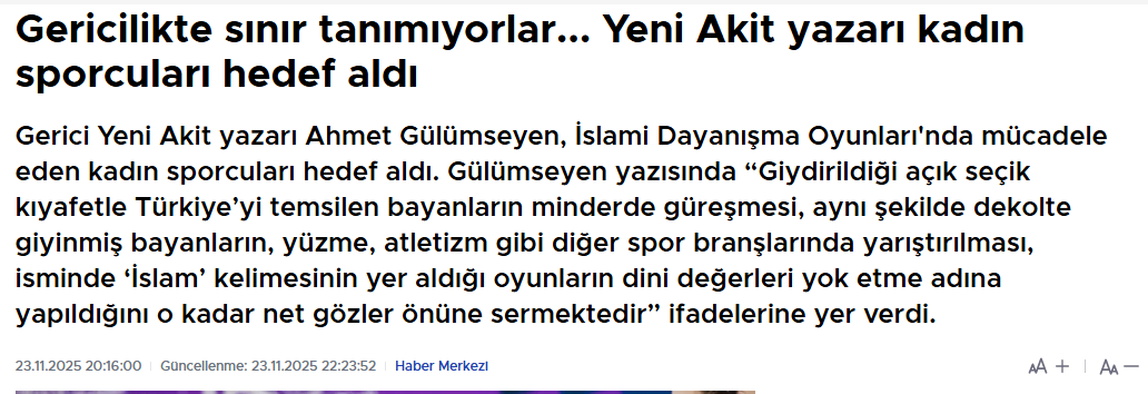 Gülümseyen'in "İslami Dayanışma Oyunları bir kez daha geride ‘enkaz’ bıraktı!.." başlıklı yazısında rahatsız olan Cumhuriyet, "Gericilikte sınır tanımıyorlar... Yeni Akit yazarı kadın sporcuları hedef aldı" haberiyle adeta saldırıya geçti.