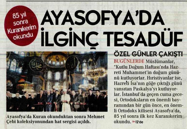 Gazete, bugünkü birinci sayfasında yer alan haberle "Ayasofya'da ilginç bir tesadüf" manşetini kullanarak Hıristiyanların Paskalya Bayramı ile Ayasofya'da Kur'an okunmasının aynı güne denk getirilerek tesadüf oluşturulmak istendiği iddiasında...