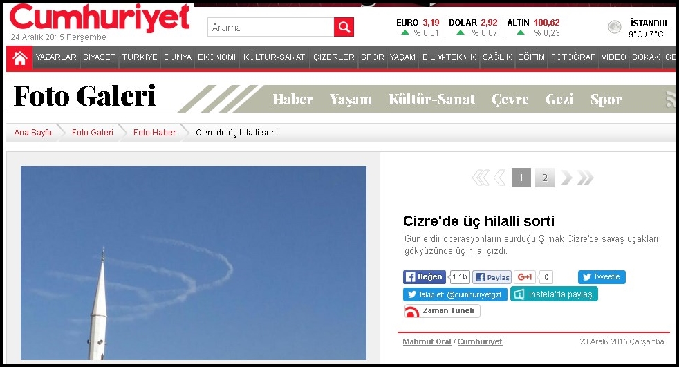 Cumhuriyet gazetesinin internet sitesinde yer alan “Cizre'de üç hilalli sorti” başlıklı haber tartışma yarattı. HDP’li vekil Ferhan Encü’nün de paylaştığı gökyüzünde uçağın arkasındaki izleri hilale benzeten fotoğraf sonrasında, uçuş doktoru olan Semih Dikkatli, “Buna 4 kol uçuşu denir ve sağa toplu manevra yapılıyor. Her yerde böyle görünür”diyerek habere tepki gösterdi.