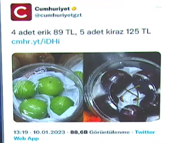 Cumhuriyet gazetesinin '4 adet erik 89, 5 adet kiraz 125 lira' başlıklı haberi sosyal medyada kısa sürede gündem oldu.