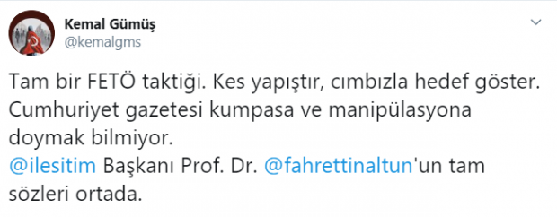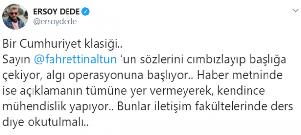 Cumhuriyet Gazetesi ise sosyal medya hesabından, haberi kesti, biçti, başlığa da cımbızlayarak ters algı meydana getirecek şekilde attı. Algı operasyonu ise anında gazetecilerin ve sosyal medya fenomenlerinin radarına takıldı. Cumhuriyet gazetesisin karakter suikastini deşifre eden gazeteciler ve sosyal medya fenomenleri şu paylaşımları yaptı: