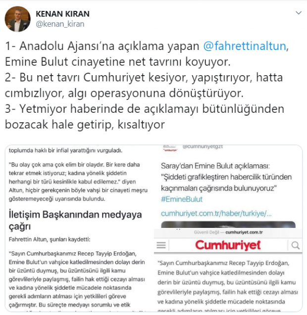 TC. İletişim Başkanı Fahrettin Altun’un Emine Bulut cinayetinin ardından yaptığı açıklamayı kes yapıştır yöntemiyle değiştiren, açıklamanın en önemli yerlerini ise sansürleyerek karakter suikastlığına soyunan Cumhuriyet Gazetesi’ne sosyal medyadan tepkiler arttı.
