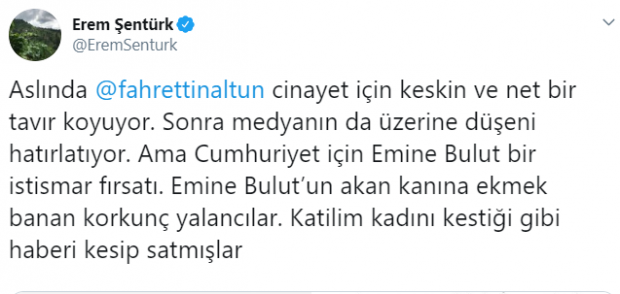 Altun açıklamasının devamında ise, "Sayın Cumhurbaşkanımız Recep Tayyip Erdoğan, Emine Bulut'un vahşice katledilmesinden dolayı derin bir üzüntü duymuş, bu üzüntüsünü ilgili kamu görevlileriyle paylaşmış, failin hak ettiği cezayı alması ve kadına yönelik şiddetle mücadele noktasında gerekli adımların atılması için yetkilileri göreve çağırmıştır. Bu süreçte medyayı sorumlu ve etik yayıncılığa davet ediyor; cinayeti meşrulaştırıcı nitelikte ifadelerden, kurbanı suçlayan, faili savunan ve şiddeti grafikleştiren habercilik türünden kaçınmaları çağrısında bulunuyoruz" ifadelerini kullandı.