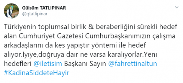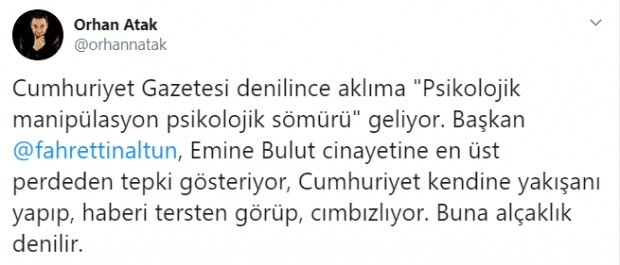 Cumhuriyet gazetesi katliamı bile algı malzemesi yaparak TC. İletişim Başkanı Fahrettin Altun’u hedef aldı. Prof. Dr. Fahrettin Altun’un Emine Bulut cinayetinin ardından yaptığı açıklamayı kes yapıştır yöntemiyle değiştiren, açıklamanın en önemli yerlerini ise sansürleyerek karakter suikastlığına soyunan Cumhuriyet Gazetesi’ne sosyal medyadan tepkiler yükseldi.
