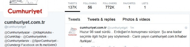 Cumhurbaşkanı Erdoğan için “Huzur 98 saat sürdü... Erdoğan'ın konuşması sürüyor. Şu ana kadar seçimle ilgili hiçbir şey söylemedi” diye tweet attılar.