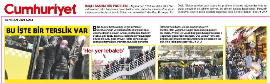 CHP yandaşı Cumhuriyet gazetesi 56 saatlik sokağa çıkma yasağının ardından dün İstanbul'da toplu ulaşımda yaşanan yoğunluğu haberleştirdi. Cumhuriyet, otobüs ve metrobüslerde oluşan görüntülerden sorumlu olan İstanbul Büyükşehir Belediye Başkanı Ekrem İmamoğlu yerine işine gitmek için toplu ulaşımı kullanan vatandaşları suçladı.