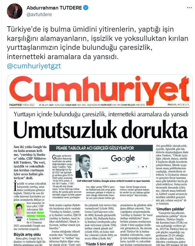 CHP Adıyaman Milletvekili Abdurrahman Tutdere ve Cumhuriyet’in manşetten haberleştirdiği ‘Son iki yılda Google’da en çok aranan cümleler -yurtdışı iş ilanları- ve -intihar etmek istiyorum- oldu’ yalanı çöktü.