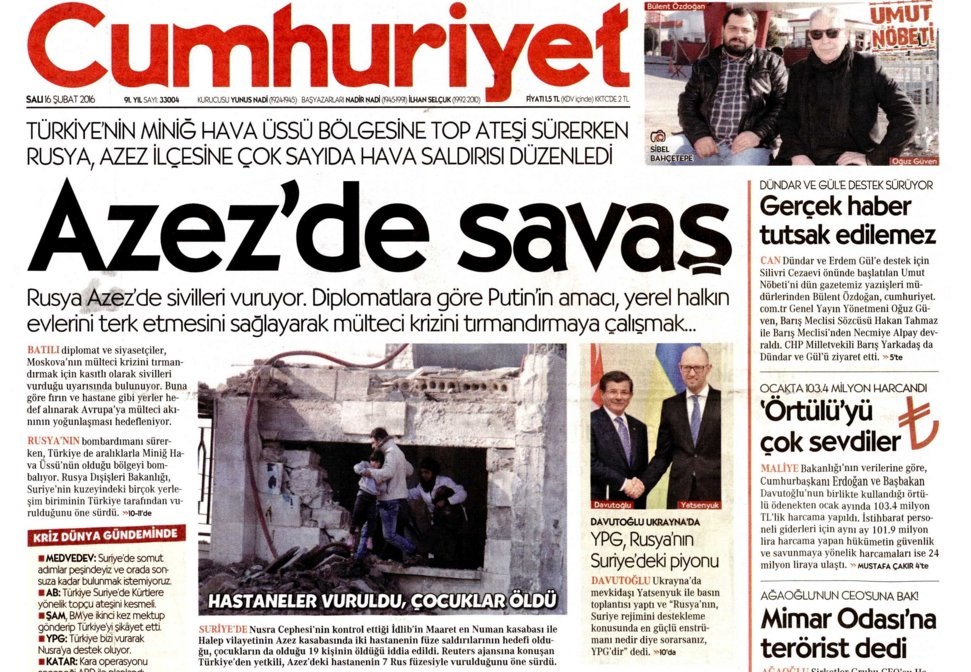 Dün Azez ve İdlib'te hastane ve okullara Rusya ile rejim güçleri tarafından yapılan saldırıları, Cumhuriyet ile Zaman gazetesi aynı manşetle duyurdu.