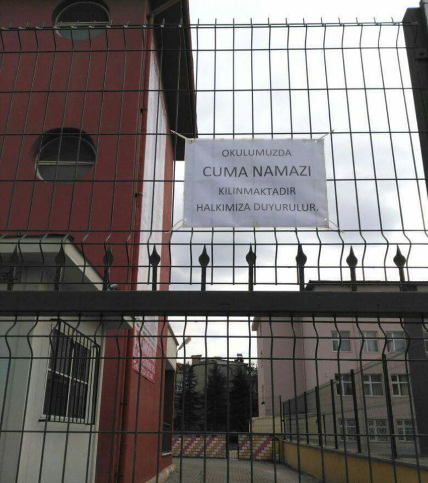 "Okulumuzda cuma namazları kılınmaktadır, halkımıza duyurulur" yazılı bir duyurunun lisenin parmaklıklarına asılmasından da hazımsızlık yaşayan Acar, aşağıdaki fotonun haberinin bulunduğu linki paylaştı.