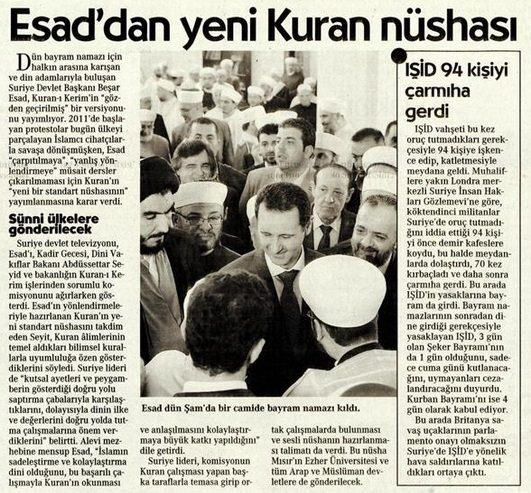 Esed'in kendi alimlerine 'Kur'an'ın yeni bir nüshasını" yazdıracağı konuşulurken katil Esed'in sempatizanı Cumhuriyet gazetesi de bu saçmalığa çanak tuttu.